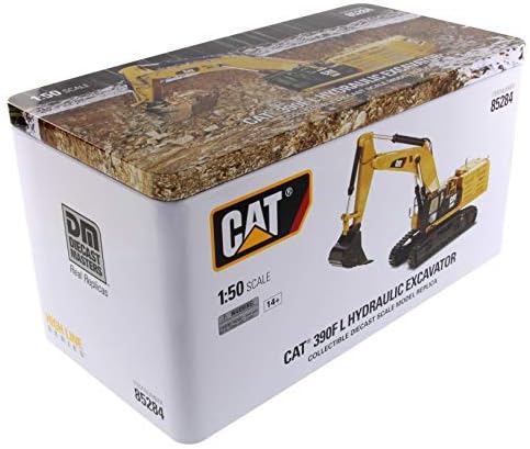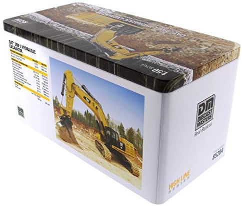 Detailed operator in cab. Comes in a collectible metal box with photos and specifications of the real machine. Detailed metal tracks and hydraulic hoses. Authentic safety decals and machine detailing. Opening engine hatch. Opening door onto deck. Independent movable tracks. Detailed interior, exterior. Made of diecast metal with some small plastic parts.
