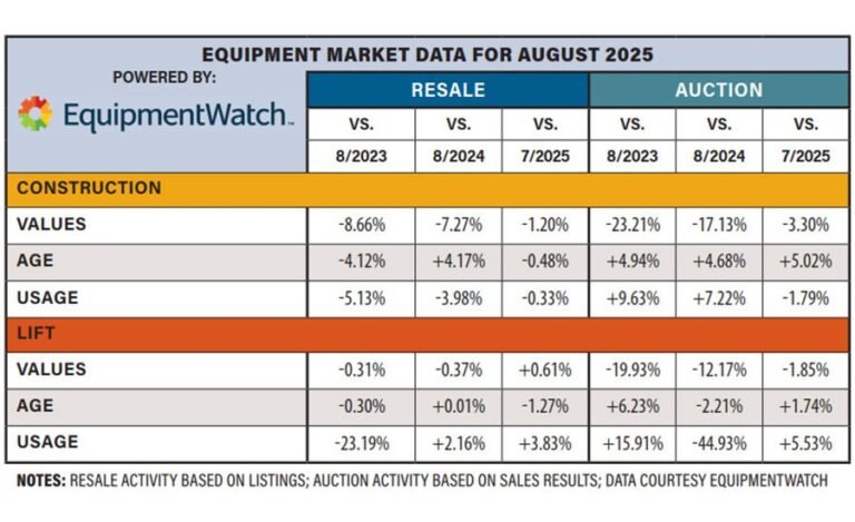 The prices of the used teams continued to drop in August, 7.27% year -on -year in resale and 17.13% at the auction. The prices also decreased the teams in the elevator category, reflecting a slow slide that has continued for most used machines categories that have been monitored throughout this year. “These values make sense to me. There is nothing crazy [in the used equipment market] Right now, “says Gallagher.” As the team’s age arrives, we hope the prices go down and the fare conversation has disappeared mainly at the moment, it had a great impact this year. “