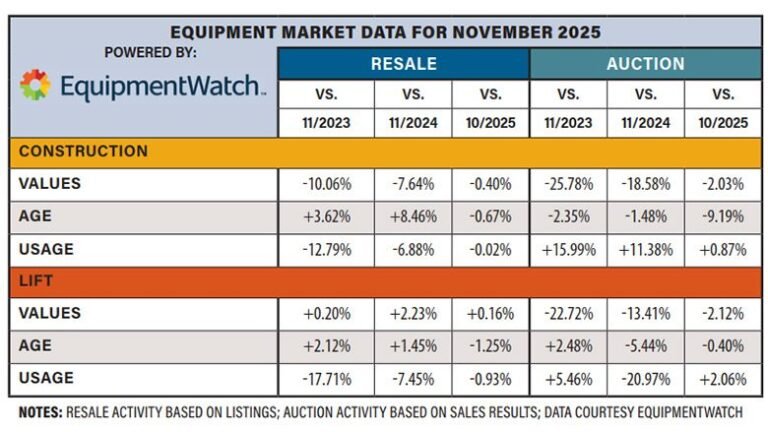 “We’re seeing declines in all categories of construction equipment, elevators and agricultural equipment,” says Brendan Gallagher, data analyst at industry analysis firm EquipmentWatch. But while there has been a steady decline in prices through 2025, used equipment in the construction auction and resale channels has been trending lower for some time, possibly showing softer long-term demand among contractors.