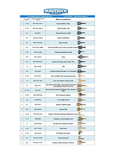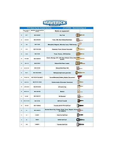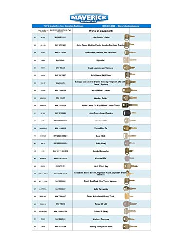 73 pc Master Complete Machinery Multi Key Set for Heavy/Construction Equipment. * Awesome for a yard with a lot of different machinery. * Professional set. * Set will work for 100+ different machines such as excavators, loaders, backhoes, tractors, lifts, generators, golf carts…….. * Designed and tested by an engineer, and tried and true for years. * Great key set to have to prevent down time. * Steel cable set secured with a permanently closed clasp. * PLEASE SEE CHART IN IMAGES FOR KEYS/ USES INCLUDED ON THIS LARGER SET