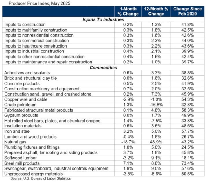 ABC said that the general prices of construction entry are 1.3% higher than last year, while non -residential construction entry prices are 1.6% higher. The prices decreased by 2 of the 3 energy categories of the BLS slopes last month. Natural gas prices dropped by 18.7%, while prices for non -processed energy materials dropped by 3.5%. Brut oil prices increased by 1.3% in May.