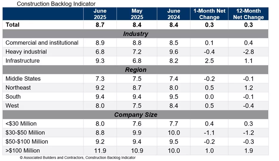 The Backlog Indicator of Associate Builders and Builders (ABC) increased to 8.7 months in June, according to a member survey, announced the association. The figure has increased 0.3 months compared to May 2025 and June 2024.