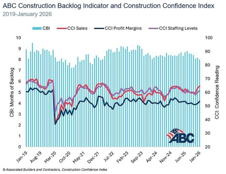 The construction backlog indicator for builders and associated contractors fell to a four-year low in January, declining 0.2 months from December, at an 8-month reading. Since January 2025, the portfolio has been reduced by 0.4 months.