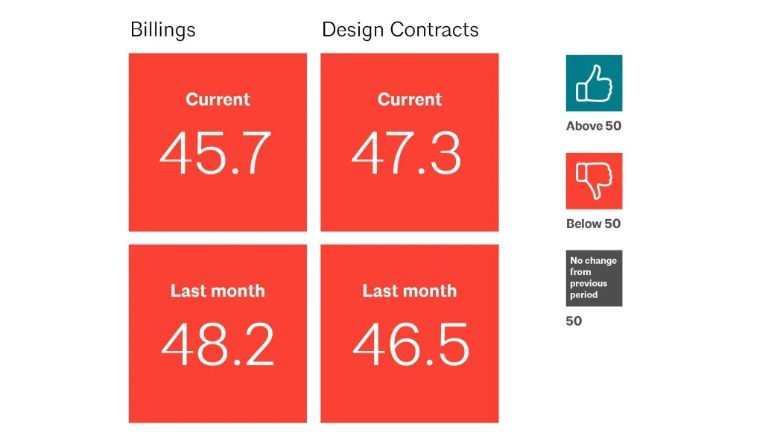 By sector, companies specializing in institutional work have experienced the smallest decline, with a three-month average score of 47.4. Commercial/industrial companies were at 46.6 and multi-family residential at 44.0.