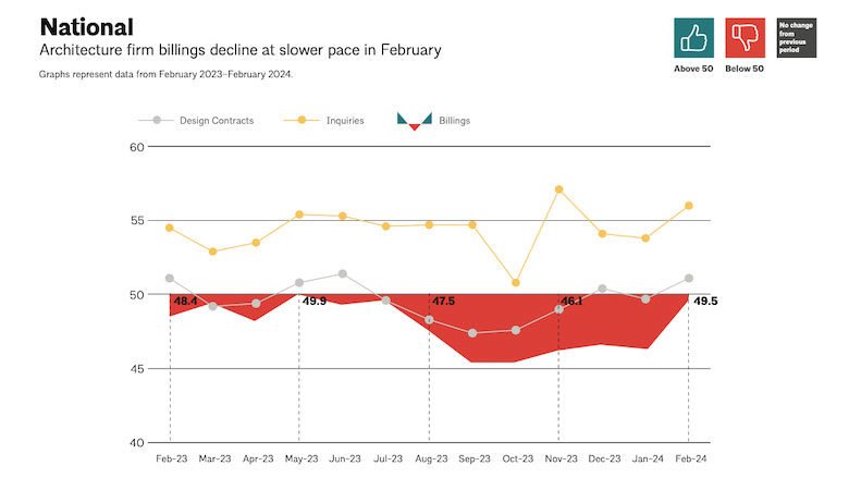 Architecture firm billings continued to decline in February, according to the latest monthly index from the American Institute of Architects/Deltek. But the report’s authors see potential benefits in the index, released on March 20.