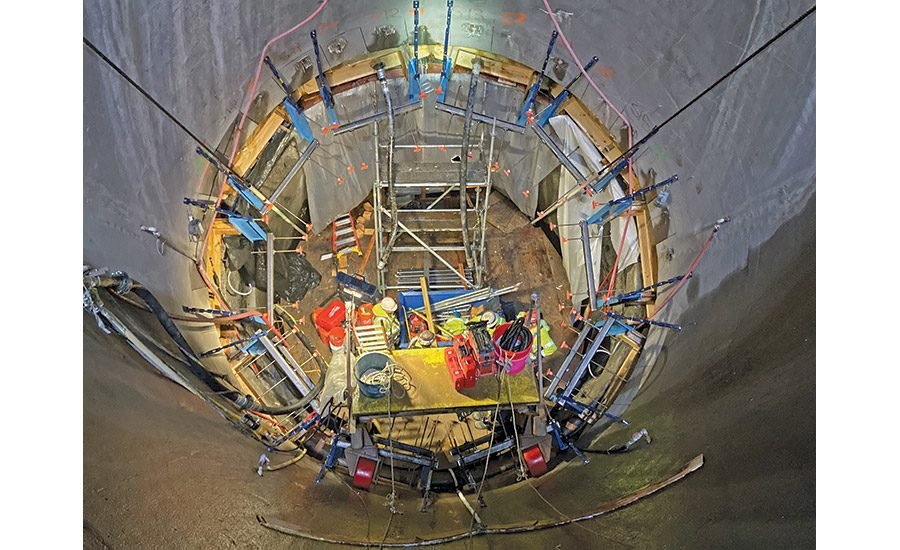 The access system designed by the contractor was critical to the success of the project. Engineered scaffolding and a custom rolling platform powered by dual hydraulic winches span the entire perimeter and slope of the tunnel, allowing safe access throughout construction.