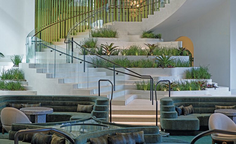 Additive manufacturing also played an important role in the project with the inclusion of 3D printed panels in the main lobby pit. Meanwhile, a NanaWall system was strategically positioned to create an uninterrupted flow between the outdoor courtyard and the hotel’s interior main lobby.