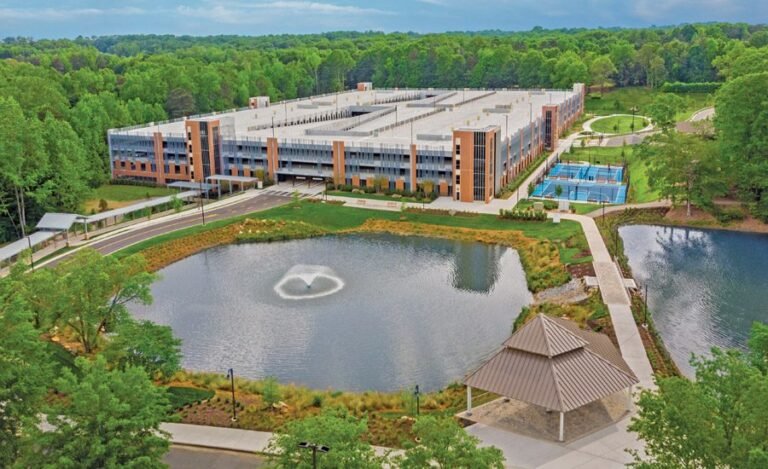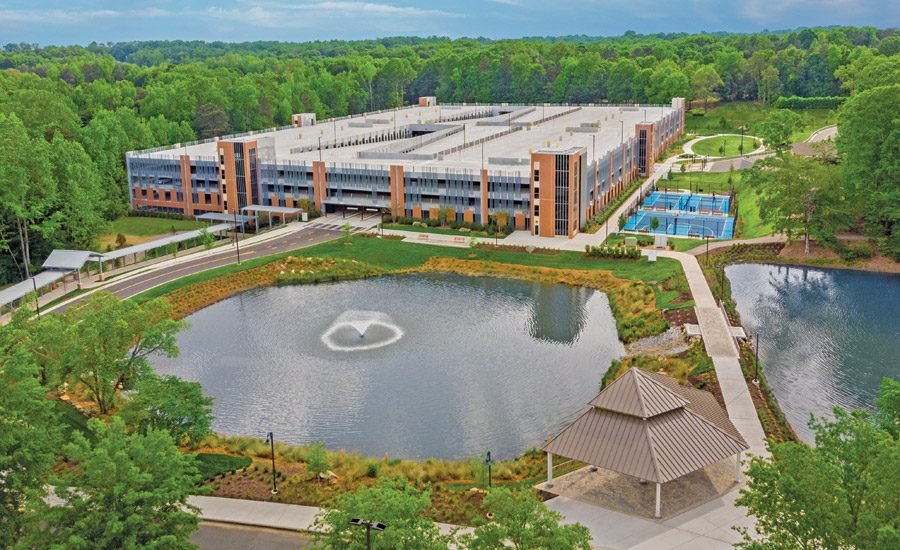 Located on an operating campus surrounded by a protected waterway, critical infrastructure and a Duke’s energy substation, the project required meticulous pre-RISC evaluations and directed security measures. One of the solutions that the team introduced to meet the security challenges of the structure was to develop pedestrian walkways that cross the length of the parking garage on both sides of the central ramps, providing a safe, well -marked and pedestrian path.