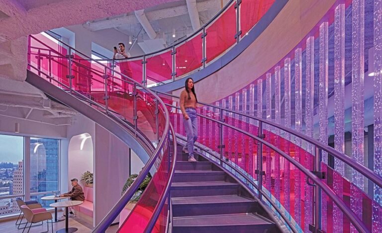 The monumental staircase features TikTok’s signature pink glass and a custom batten system that brings unique digital elements, while murals and graphics by local artist Morgan Zion relate to Seattle culture.