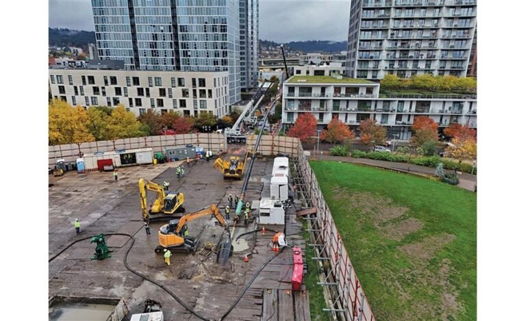 Geologic challenges include contaminated fill, alluvium, cobbles, and boulders that extend 194 feet deep. The team employed innovative telescopic surface casing systems, which combined pneumatic pipe impact with retractable Direct Pipe technology to advance through unstable formations.