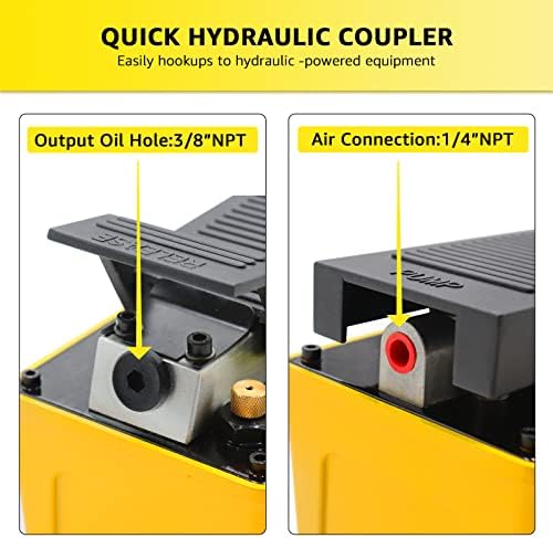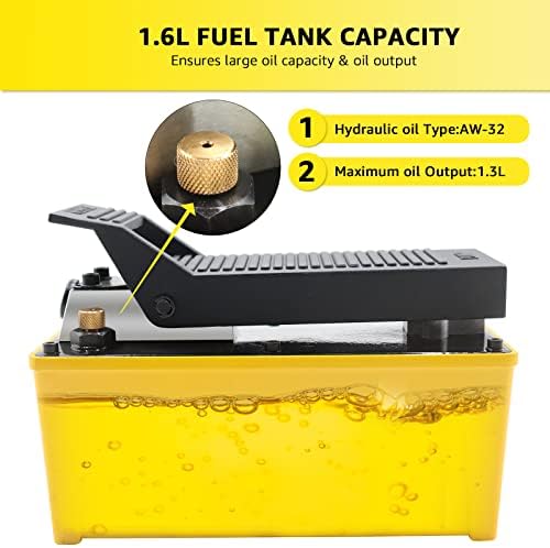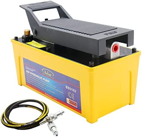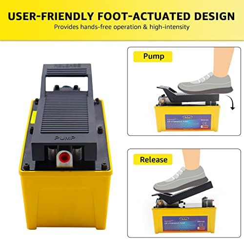 The air over hydraulic pump features a user-friendly, foot-actuated design that allows for easy control and operation, saving time and effort with its powerful and adjustable pressure. The built-in internal relief valve safeguards the hydraulic components regardless of the hydraulic pressure.