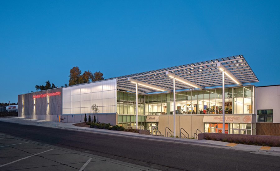 The 39,000 square meter school’s six majors (automotive, construction, culinary arts, nursing, entrepreneurship and early childhood education) correspond to laboratory spaces where students gain hands-on experience. The automotive lab features hydraulic lifts, overhead doors and an exhaust containment system. The Culinary Arts Lab is a commercial-grade design kitchen with cooktops, ovens, sinks and prep space and its own exhaust system. The nursing laboratory clinic has a patient bed unit and professional level finishes.