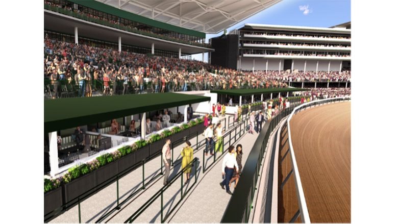 The project will replace about 6,400 existing seats with a 7,800-seat structure that includes private suites, indoor and outdoor dining and covered seating. Victory Run is scheduled for the first lap of the i-mile racetrack, between the First Turn Club and Skye Terrace, which track officials say will offer sweeping views of the finish line and the 1,234.5-foot finish line.