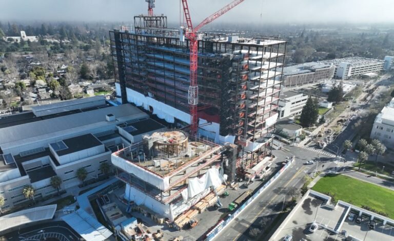 The frame of the 14-story UC Davis Medical Center’s California Tower was completed last February. The project, which will add nearly one million square feet of space to the facility, is scheduled for completion in 2030.