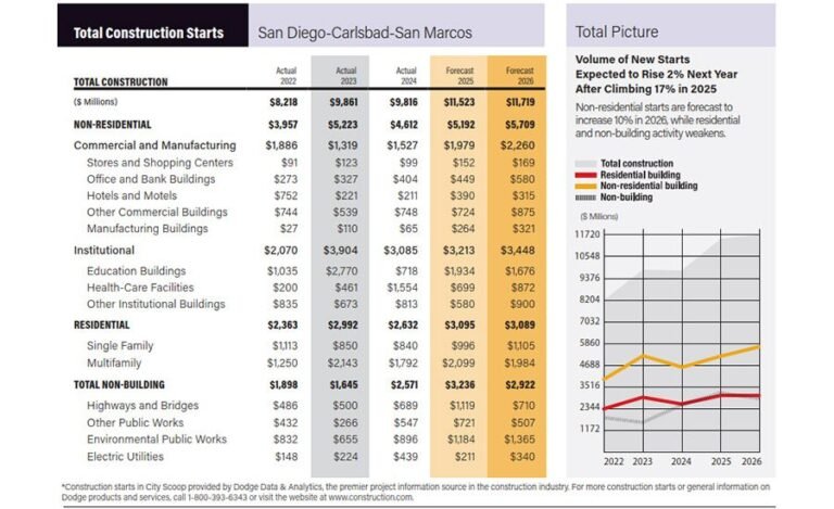 “The San Diego region is finding stability in publicly funded or mandate-driven projects. Three key sectors: health care, student housing and community colleges) are doing exceptionally well thanks to secure funding,” he says.