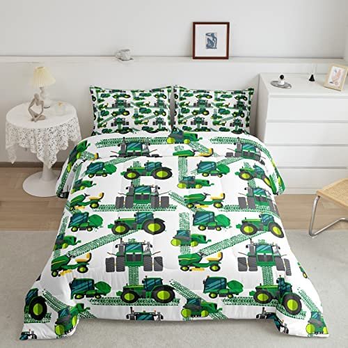 Erosebridal Boys Cartoon Car Bedding Set, Equipment Trucks Comforter Set Full, Excavators Quilts, Heavy Machinery Truck Crane Duvet Insert for Kids Girls Teens Construction Site Cars Comforter,Green