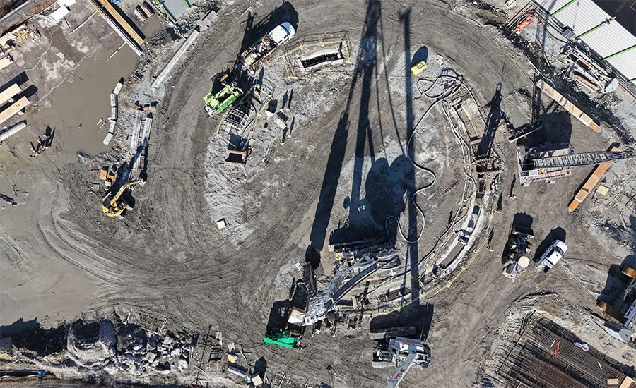 An aerial view shows construction of a bridge and excavation adjacent to the Tonnelle Avenue site in North Bergen, NJ, where work is underway to create access for TBM components for the Hudson Tunnel Project.