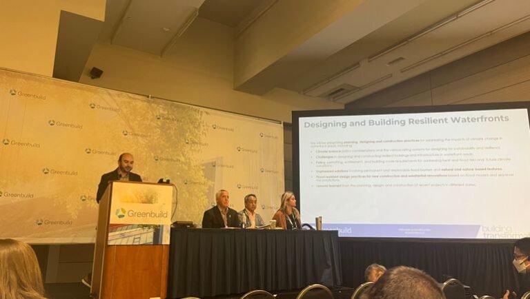 Waterfront developments are both prized and uniquely vulnerable to extreme weather conditions, and building a resilient waterfront project requires a multifaceted approach with all stakeholders, green building experts said during a panel at the Greenbuild 2023 International Conference and Expo.