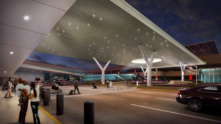 The new canopy will replace one that was blown down by a hurricane years ago. “For years, the big columns stayed there,” says Massey. With Hobby’s proximity to the Johnson Space Center, “we used computational design to place a starry sky motif” on the new canopy, he adds. “In terms of sense of place, it’s about Houston.”