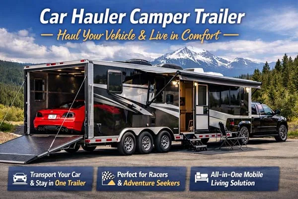 A car transporter motorhome trailer is designed for people who refuse to choose between transporting a vehicle and having a comfortable place to stay. Instead of towing a separate car transporter and caravan, this hybrid trailer combines both functions into a well-balanced system. It allows you to transport a car, ATV, side by side or work equipment while providing sleeping space, storage and everyday comfort. For long road trips, race weekends, overland trips or mobile work, a car camper trailer makes it simple by reducing setup time, stress and operating costs.