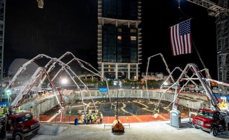 Future residents of Bentley Residences in Sunny Isles Beach, Fla., may not realize that their 62-story oceanfront luxury condo tower rises from a bit of history: a 15-foot-thick foundation formed by the second largest continuous pour of concrete in the US to date.