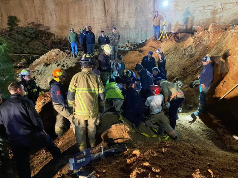 According to firefighters, crews began digging with hands and shovels and formed a “bucket brigade” to remove dirt from the immediate area. After more than three hours, a skid steer and another backhoe joined the effort to move larger amounts of dirt, allowing the buried backhoe to be revealed.