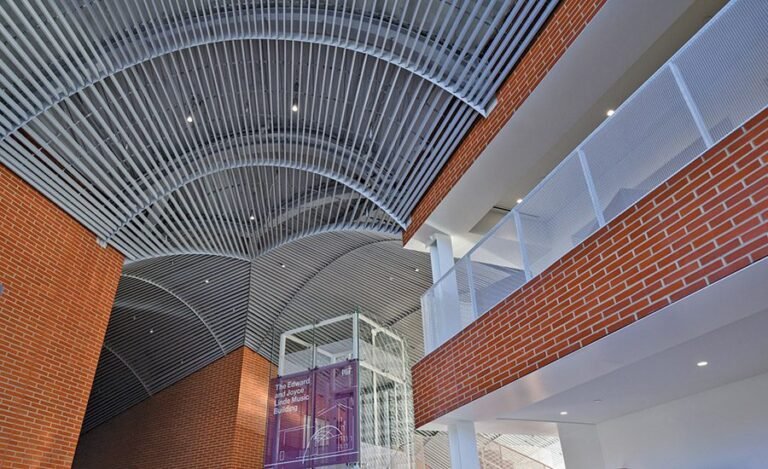 The three-building complex includes a music technology suite, recording studios, rehearsal spaces, faculty offices, classrooms and the lobby. Acoustic clouds located 60 feet above the ground in the performance lab could not be built as designed.