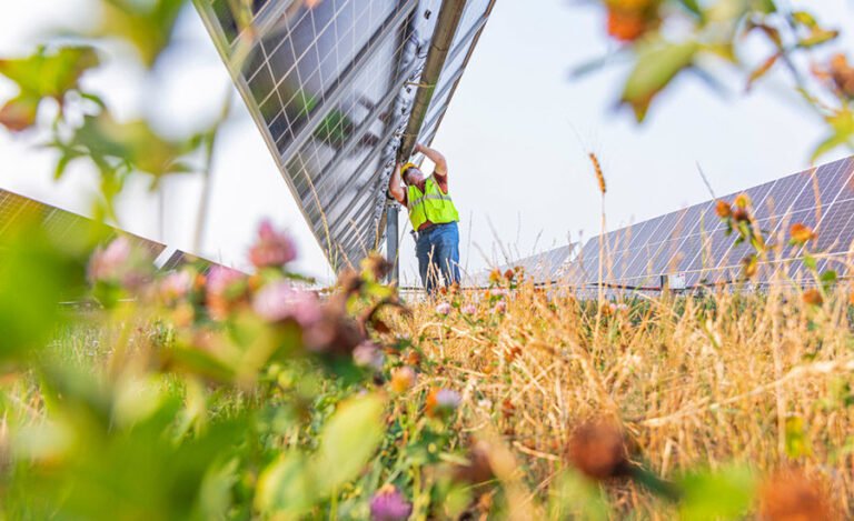 Workers install a panel amid pollinator-friendly plants at an Alliant Solar Energy site.