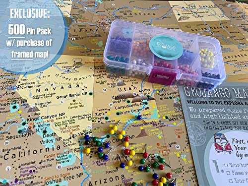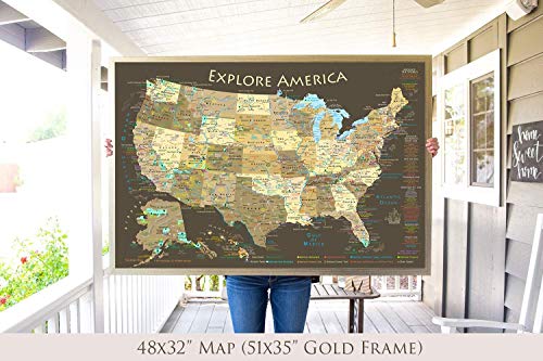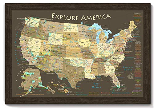 National Parks Map and USA Map – Explore America Map – Large Framed Push Pin Map – Brown Edition – Includes 500 map pins