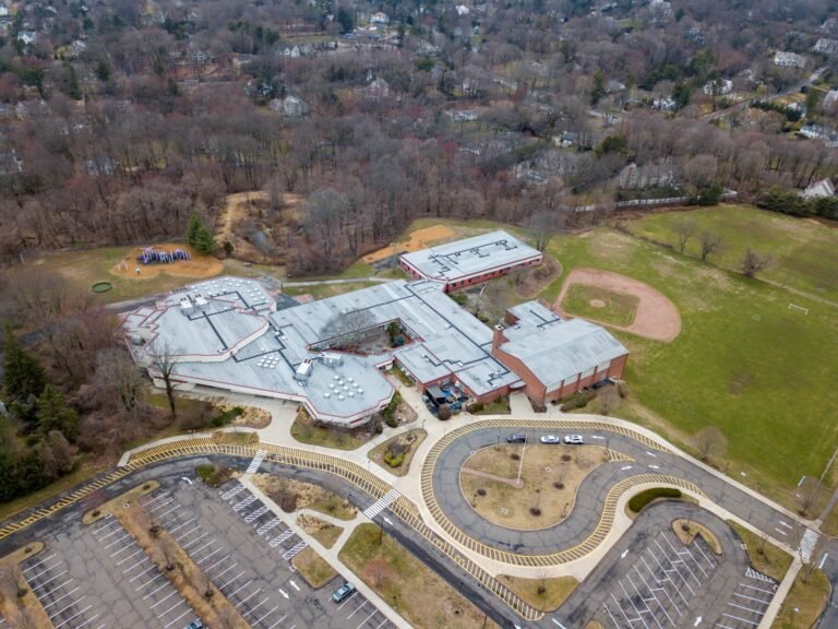 Part of the Long Lots Elementary School campus. The community gardens (not shown) are located to the south of the school. (Drone photo/Brandon Malin)