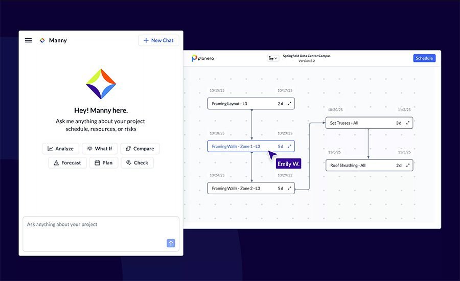 Schedule analysis can be a slow, manual process limited to estimators, planners, and sometimes project managers. Manual data entry is still the norm for many small and mid-sized contractors. Manny from Planera AI allows users to interact with agenda data using natural language. Teams can ask questions, surface critical path drivers, and run “what if” simulations in minutes.