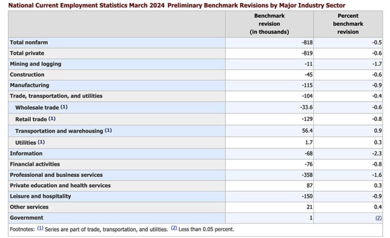 The Bureau of Labor Statistics cut the previously reported number of new jobs by 0.5% from March 2023 to March 2024, according to a recently released update.