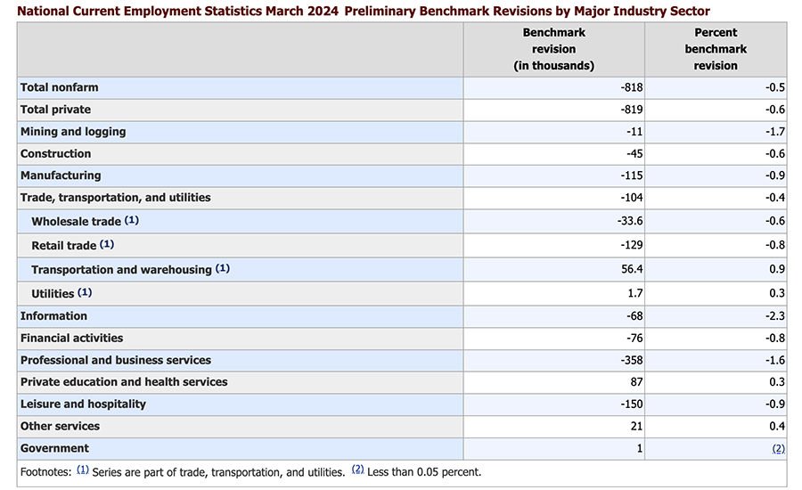 The revision, in the agency’s preliminary benchmark announcement of current employment statistics, reduced the number of jobs by 818,000, 45,000 of which were in the construction sector. The reduction is based on unemployment insurance tax records submitted by states.