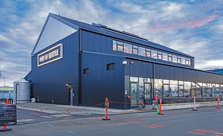With ground broken in May 2024 on the $37 million project, the port-owned building reached substantial completion in February, although work is underway on site to wrap up construction before tenant improvement requests are made. It will be leased by Washington Maritime Blue as a collaboration center for a confluence of major maritime industry stakeholders.