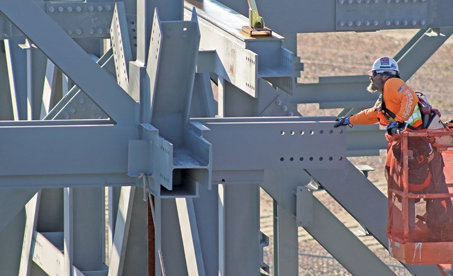 This photo, February 2024, during an elevator operation at the Parkion, shows a Bechtel worker who helps with the precise placement of a steel beam when the contractor builds the base of the mobile launcher.