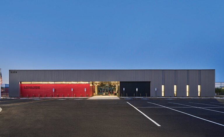 Sundt worked with the design team to develop “a clean yet bold aesthetic with enhanced metal cladding, high-quality glass and a touch of Sundt Red with glazed tiles,” according to a Sundt statement. The training center features indoor and outdoor indoor lab spaces along with two hybrid classrooms for face-to-face and virtual events, a 200-seat auditorium with advanced AV/teleconferencing capability, two LED video walls, a kitchen catering and a pre-function space for conferences. and events The outdoor space consists of a 7,500 square meter pre-engineered canopy with HLVS fans and power for tools and equipment used for hands-on vocational training.