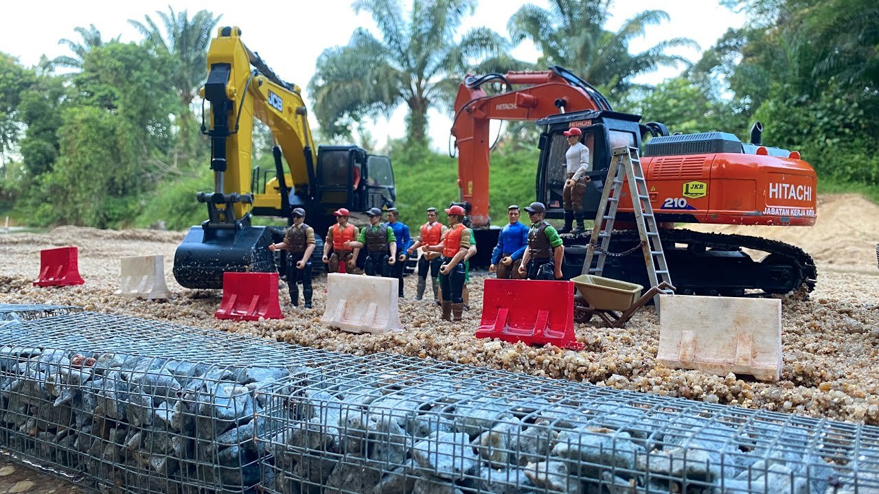 Story Line : RC Excavator JCB & Huina 1580 & CAT Long Arm Making Gabion Cube Project