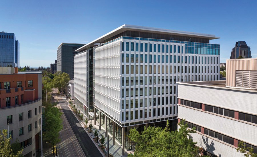Energy conservation is a hallmark of this California state office building in Sacramento, one of the world’s first net-zero energy, net-zero carbon, and all-electric government office facilities. state The project team says the offices are a “benchmark” for state Department of General Services buildings, “setting a new standard of sustainability and flexibility for the state.” The 10-story, 472,000-square-foot building runs on 100 percent renewable energy through community solar agreements that result in 103 percent energy savings over baseline. This approach provides utility cost savings to the state and gave the local Sacramento company the customer commitment it needed to justify further solar farm development and investment. A centralized building management system enables real-time analysis of building performance and adjustment of mechanical systems, including a low-friction air supply system and a water-to-water heat pump. The building has 100% LED lighting and individual work lights and charging points for electric vehicles. It received LEED Platinum and CalGreen Tier 2 certifications. The exterior facade is overlaid with a precast/preglazed fiberglass reinforced concrete enclosure that improves the building’s insulation and improves thermal performance, according to the project team . The facade also responds to the different environmental conditions on each side.