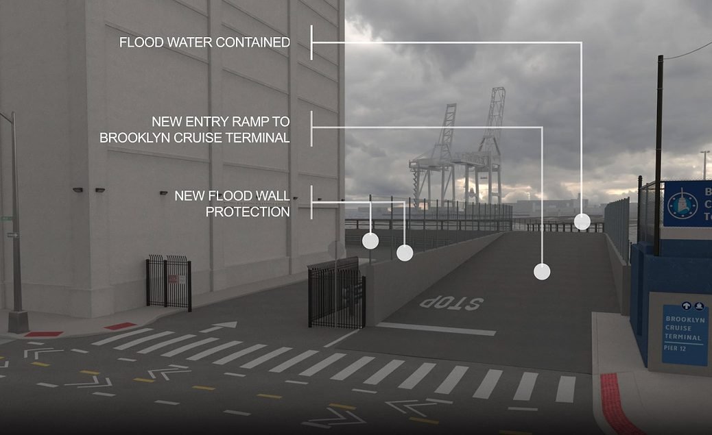 The final design calls for more than a mile and a half of wall up to five feet high, along with eight roll-up doors and two drop-down designs. Near the Atlantic Basin, an inlet that houses the Brooklyn Cruise Terminal and a New York ferry stop, the street elevation and flood walls will overlap to create a permanent flood structure. Vehicles will enter and exit via a permanent ramp, Isaac said.