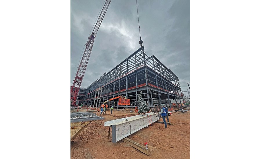 Located in level slabs, the Shell buildings on the Holly Springs plant are framed with isolated panels. For the two phases of the project, the sections of the founding slabs of the DSM buildings are up to 18 inches thick, depending on the soil load requirements. Autonomous robotic ink printers are used to establish precise plans directly on slabs, helping to reduce clashes in the field.